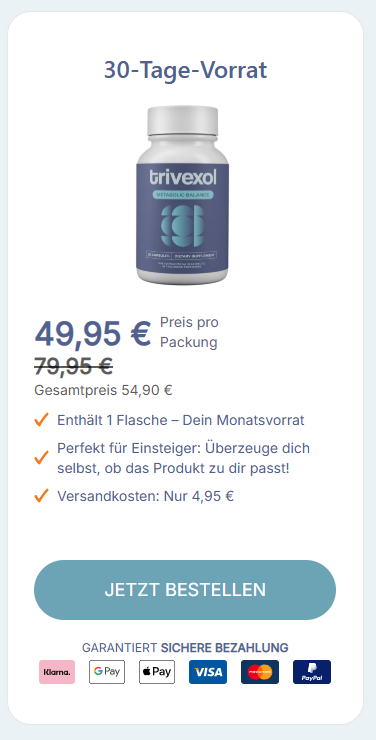 Haftungsausschluss: Die auf dieser Website dargestellten Inhalte und die genannten Ergebnisse des Produkts Trivexol können von Person zu Person variieren. Dieses Produkt ist ein Nahrungsergänzungsmittel und dient nicht dazu, Krankheiten zu diagnostizieren, zu behandeln, zu heilen oder zu verhindern. Die Informationen auf dieser Seite ersetzen keine professionelle medizinische Beratung. Konsultieren Sie immer einen qualifizierten Arzt, bevor Sie mit einer neuen Supplementierung beginnen, insbesondere wenn Sie schwanger sind, stillen, Medikamente einnehmen oder unter ärztlicher Aufsicht stehen. Die offizielle Website ist die einzige Quelle für die Geld-zurück-Garantie und den autorisierten Kundensupport.